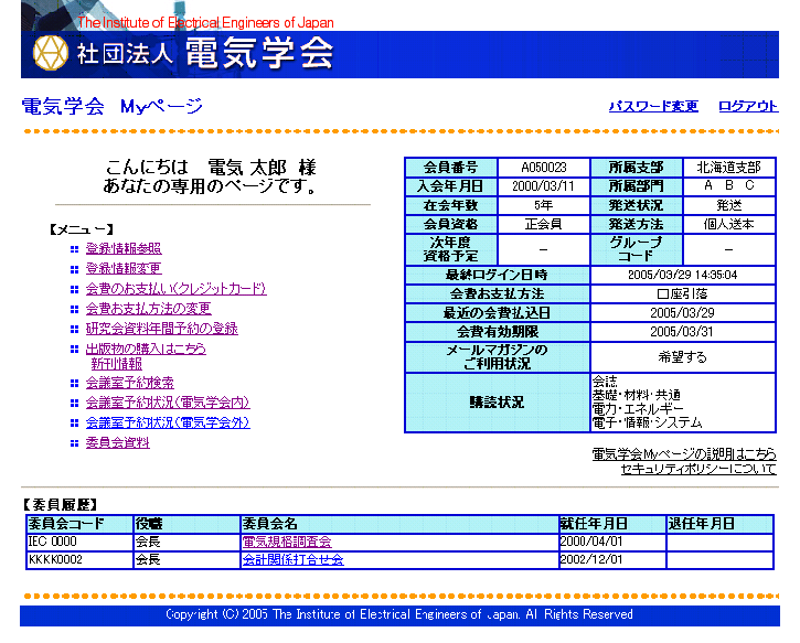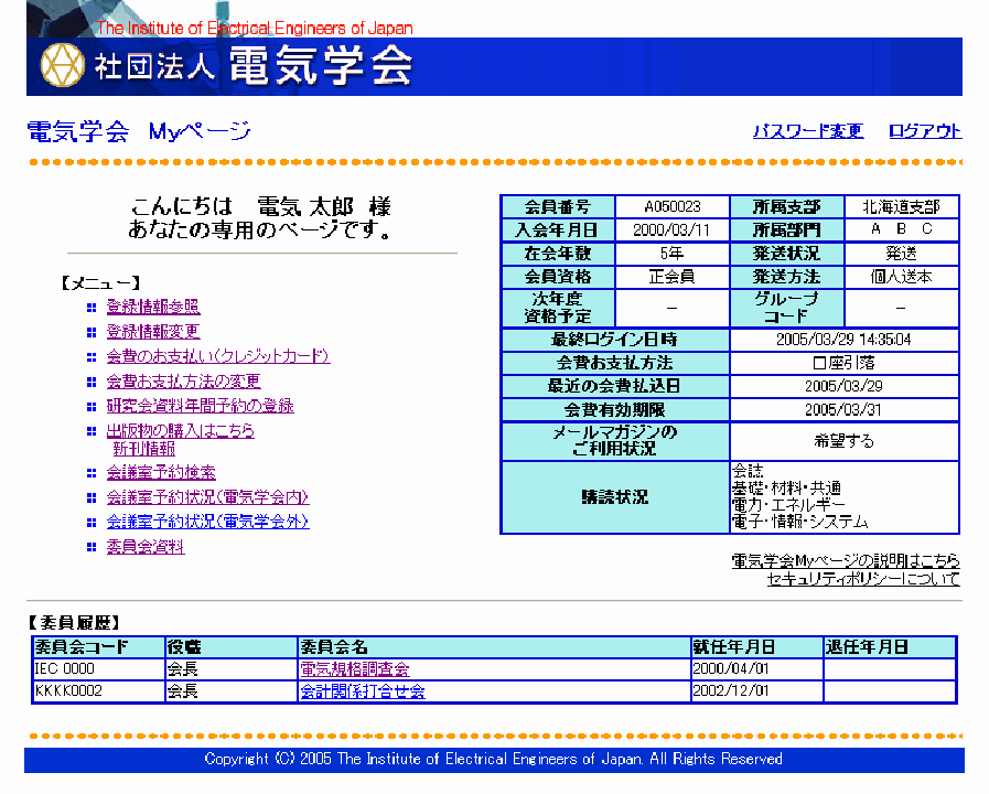 - 「Myページ」はご自身の個人登録情報,委員履歴などの閲覧ができるとともに,「メニュー」にある各項目にアクセスすることにより,住所などの登録変更,研究会資料の年間予約,出版物の購入などがでます。