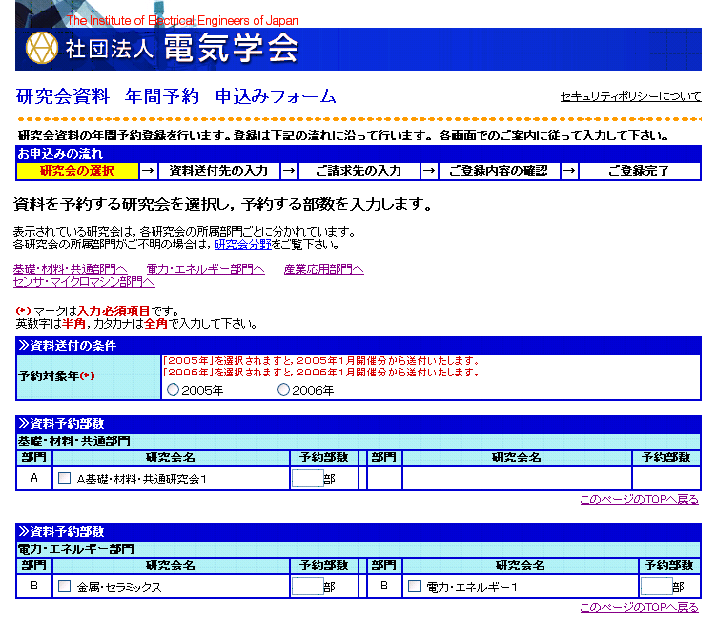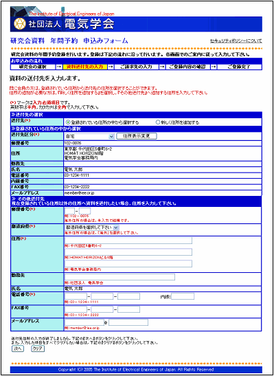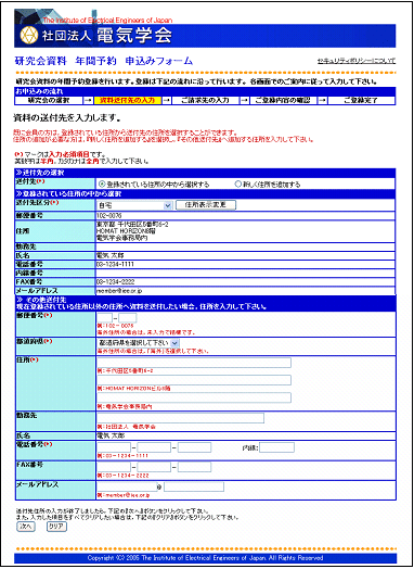 - 研究会資料の年間予約申込みが次の画面より行えます。会員の方の氏名,住所などの情報は自動入力されます。