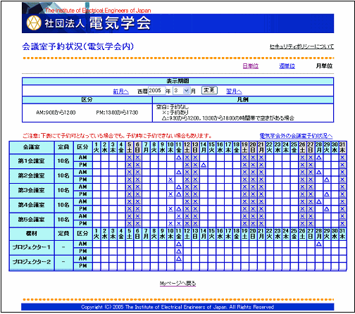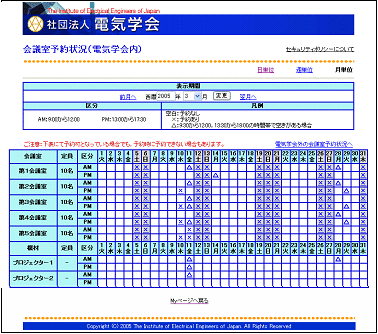 - 会議室の予約状況が日,週,月単位で閲覧できます。