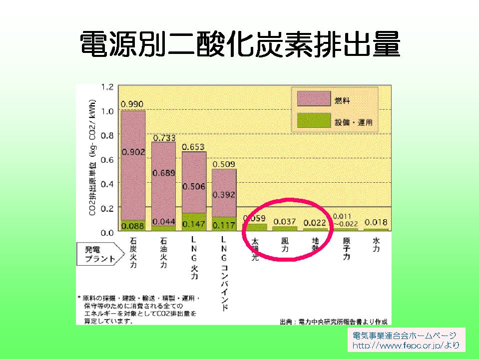 これは電気を生み出す際に排出されてしまう二酸化炭素の量をグラフにしたものです。環境に与える影響を考えると,この値が小さければ小さいほどいいんですけど,このように太陽光,風力,地熱といった新エネルギーは,ちょっとしか二酸化炭素を出さないので,環境にやさしいですね。