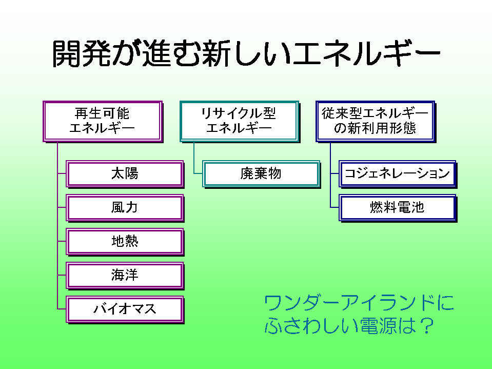 この新しいエネルギーは,太陽や風など無尽蔵にある自然の力を利用した「再生可能エネルギー」,今まで捨てていたエネルギーを使う「リサイクル型エネルギー」,エネルギーをより効率よく利用する「従来型エネルギーの新利用形態」などいろいろあります。いっぱいあって,目移りしてしまいますね。ワンダーアイランドにはどの電気の素がいいか,それぞれの特徴などについてちょっと調べてみました。まあお聞きください。