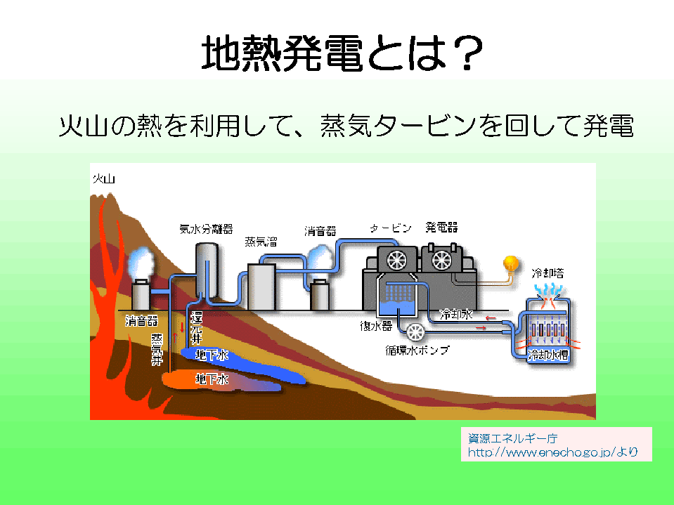 まず,地熱発電では,この絵のように火山の熱を利用して蒸気タービンを回して発電することになります。エネルギー源は,火山の熱,つまり大地の熱です。