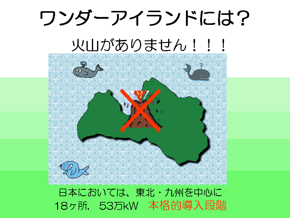 さて,この地熱発電は,ワンダーアイランドには果たして導入できるかどうかというと,残念!かんじんの火山がないので無理ですね。(ただ,現在日本では,東北,九州地方を中心に18ヶ所,約53万キロワットを超える電源となり,本格的な導入段階を迎えているといえます。)