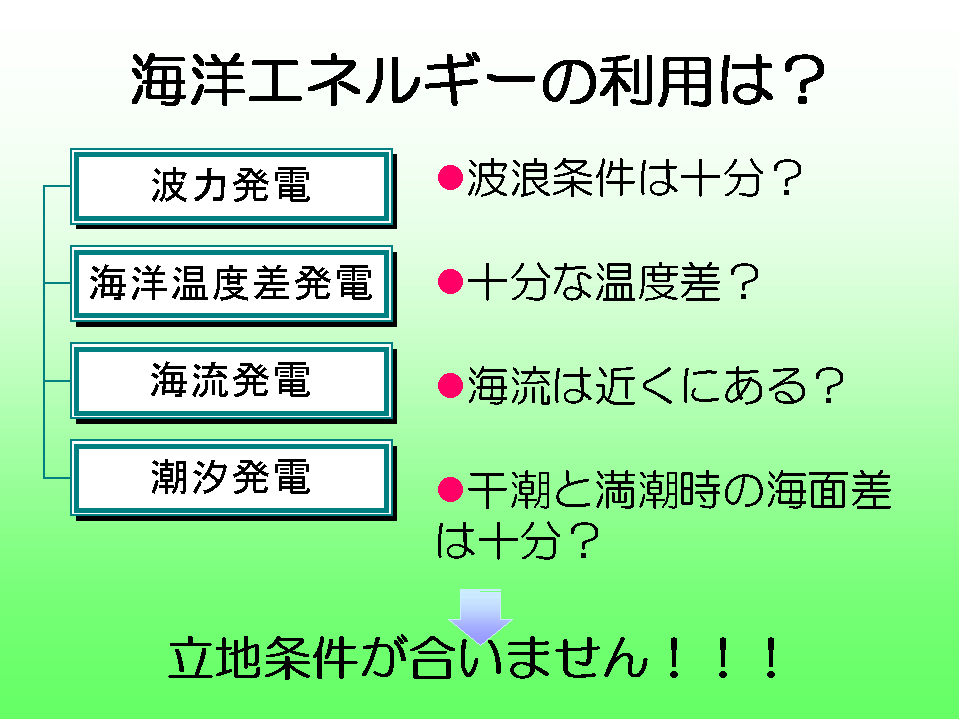 さて,ワンダーアイランドは海に囲まれていますから,当然海洋エネルギーの利用も良さそうですよね。地球の表面積の約7割を占める海は,膨大なエネルギー源として古くから利用が試みられてきました。その方法には,波力発電,海洋温度差発電,海流発電,潮汐発電の4種類があります。では,ワンダーアイランドには果たして導入できるかというと,それぞれ,このような条件を満足せねばならず,立地条件が合わないので利用するのは難しいと思います!