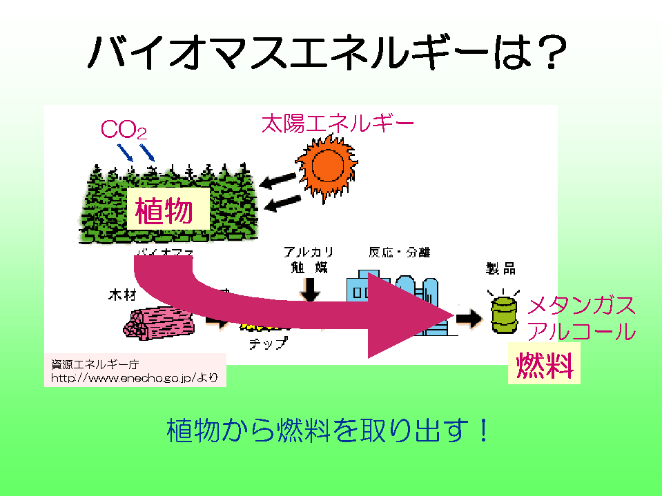 バイオマスエネルギーを電気の素として利用することもできます。これはどういういことかというと,まず植物には,光合成によって太陽エネルギーが蓄えられています。そしてその植物を材料に,アルコール発酵やメタン発酵を行い,燃料を取り出し,燃やして電気を作るのです。つまり,植物さえあれば,植物の光合成という機能を通じて,太陽エネルギーを取り出せるのです。