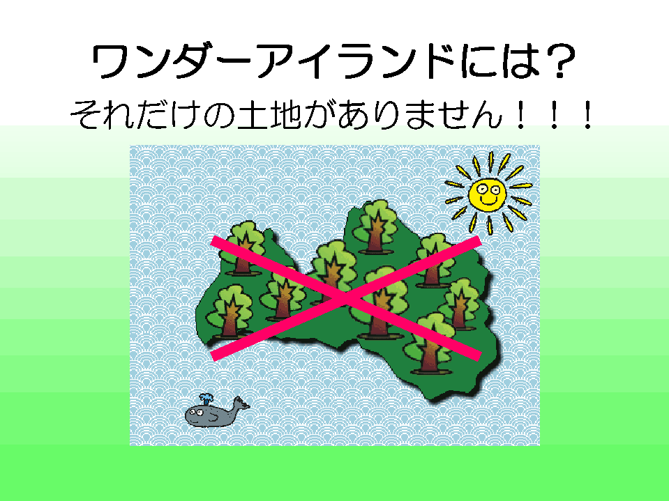 では,ワンダーアイランドの電気をバイオマスエネルギーで賄えるのかというと,残念ながらちょっと無理そうです。使うのにつりあう量の植物資源が必要です。残念ながら,ワンダーアイランドには,それだけの植物を育てる土地がありません。