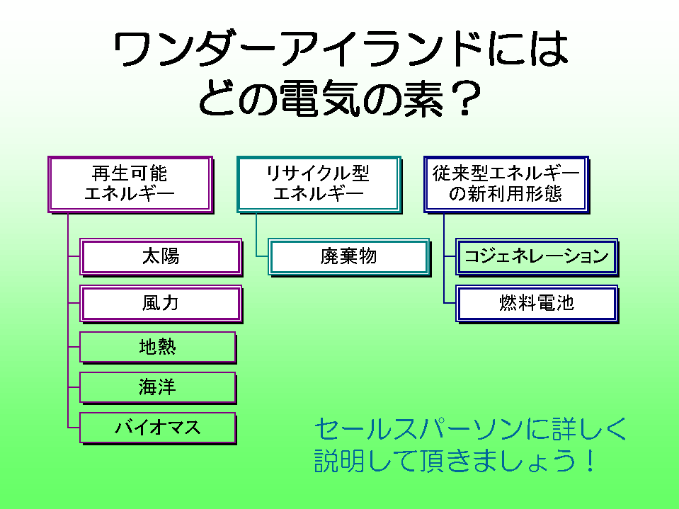 「『ワンダーアイランド』は海に浮かぶ小さな無人島です。ここに新しい街をつくろうと新任の市長は考えました。街をつくるためには電気が必要です。市長は「電気の素」を何にしようか悩んでいます。市長の街づくりの構想を受けて,市長秘書は「電気の素」を調査し,現在の日本のエネルギー事情と,新エネルギーの全体像をレポートします。つづいてセールスパーソンたちが登場し,「風力発電」,「太陽光発電」,「燃料電池発電」,「廃棄物発電」を取り上げて,発電のしくみや,実際に現在どのように使われているか,そして,ワンダーアイランドでの「電気の素」にふさわしいかどうかなどをプレゼンテーションし,市長と秘書に売り込みをかけます。プレゼンテーションのあと,市長と秘書はセールスパーソンたちに素朴な疑問を投げかけますが,案外鋭い問いかけだったりします。セールスパーソンどおしで論じ合うことで,それぞれの長所短所も明らかになります。