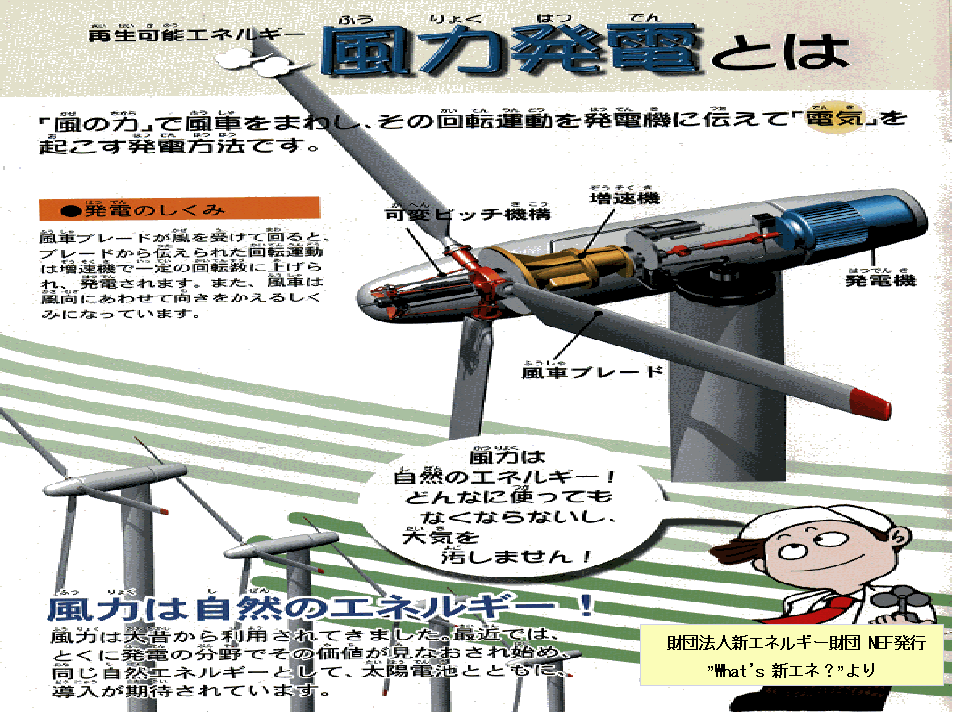 これは発電の原理を示したものです。風車ブレードに風があたると,ブレードはこれを回転エネルギーに変換し,発電機を回して電気をおこします。電気の素は,自然のエネルギーの風ですので,どんなに使ってもなくならないし,大気を汚しません。新しい島にはうってつけのシステムです。