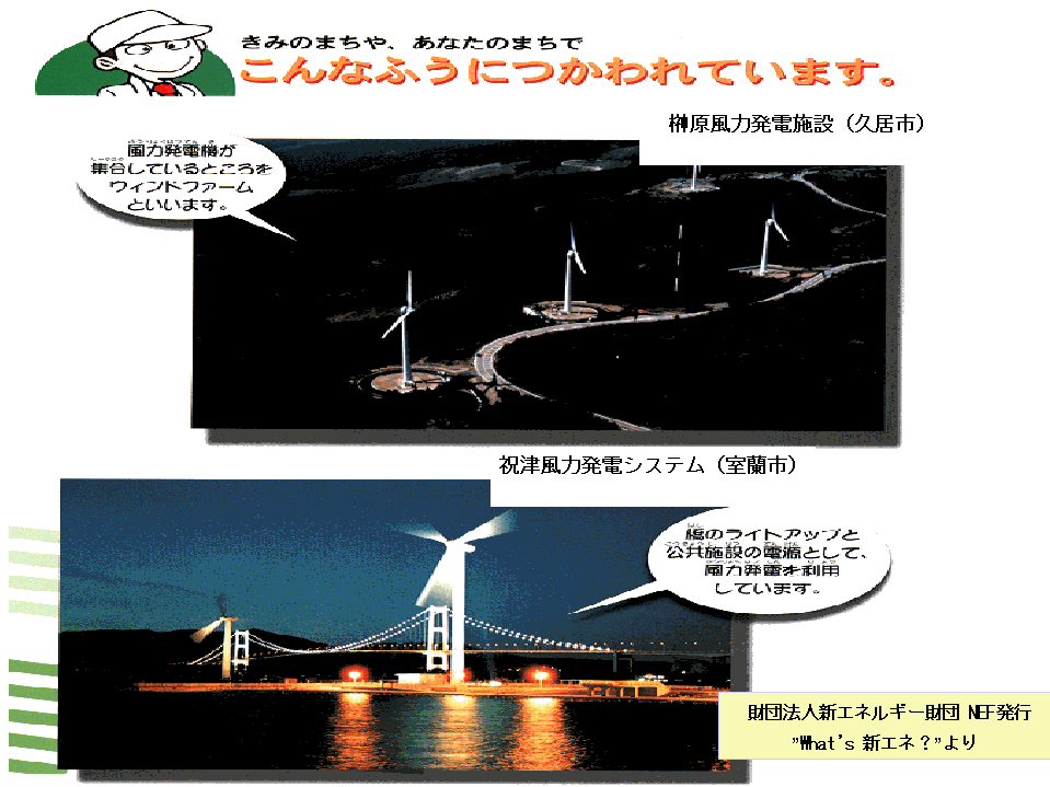 ご覧のように,今では日本の各所で風車がまわっています。風車が林立したウィンドパークや,公共施設のライトアップ電源用など,従来の発電設備と一味違った風景ですよね。