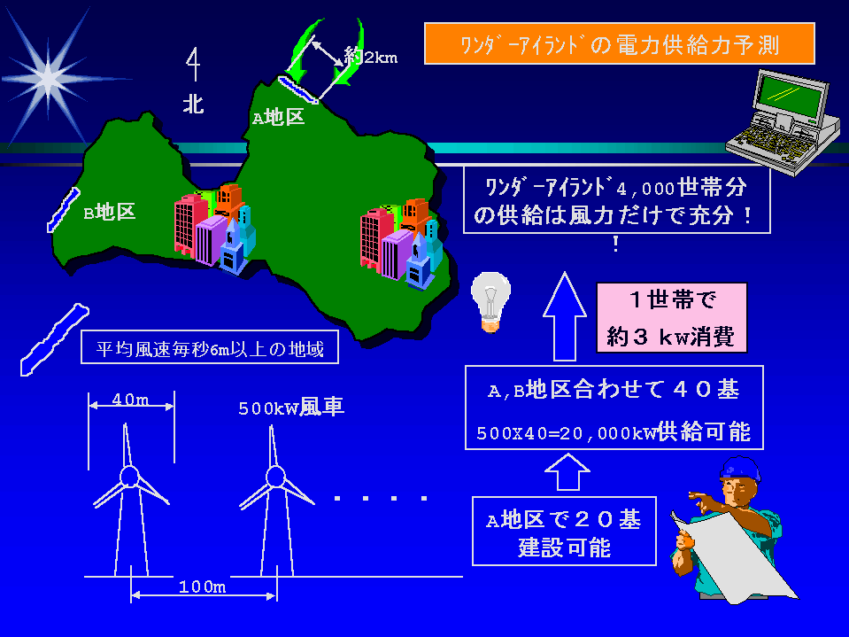当社では,すでにワンダーアイランドの環境データを実測し,建設プランを策定しております。風力発電では,発電効率が良くなるのは平均風速毎秒6メートル以上の場合です。ワンダーアイランドの場合,ご覧のようにA地区とB地区が該当しています。当社の500キロワット級風車の場合,風車ブレードの直径が40メートルですので,A地区に20基,B地区に20基合計40基の建設が可能で,その場合に供給可能な電力量は合計2万キロワットになります。一般のご家庭の消費電力は1世帯あたりで約3キロワットですので,ワンダーアイランドの予想世帯数5千家分は,風力発電だけで充分供給可能です。どうです?とっても魅力的なエネルギーでしょう!
