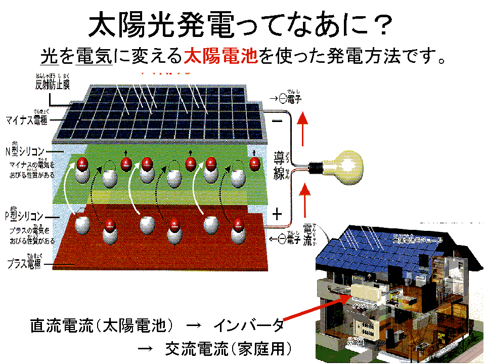 太陽光発電とは,太陽電池を使って太陽の光から電気をつくる方法です。太陽電池は2種類の性質の違うシリコンからできていて,太陽の光があたると,この2種類のシリコンの間に電気ができるようになっています。この太陽電池で作られる電気は直流電流なので,インバータを使っておうちの中で使える交流電流にしています。