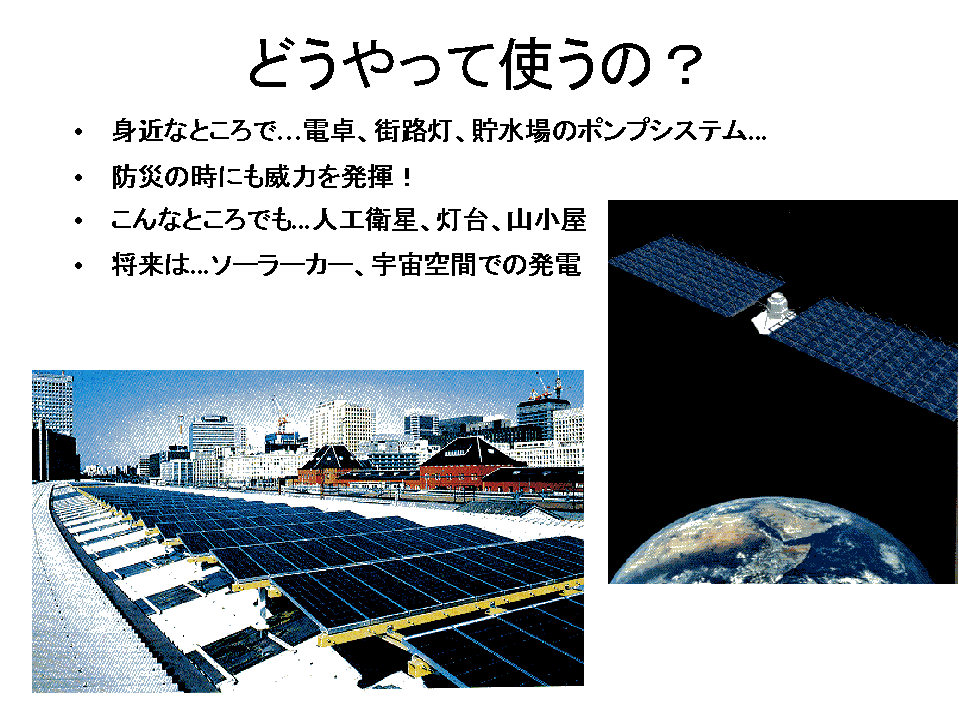 また,目に見えないところでも太陽電池は一生懸命働いています。山小屋や灯台のように電気をひきにくいところにも,自家発電用の電源として使われています。まだまだ改良は必要ですが,将来はソーラーカーや宇宙で発電を行うなど,未来のエネルギーとして夢はどんどん膨らみますね。この夢のあるエネルギーは,市長さんのワンダーアイランド構想にぴったりではありませんか?