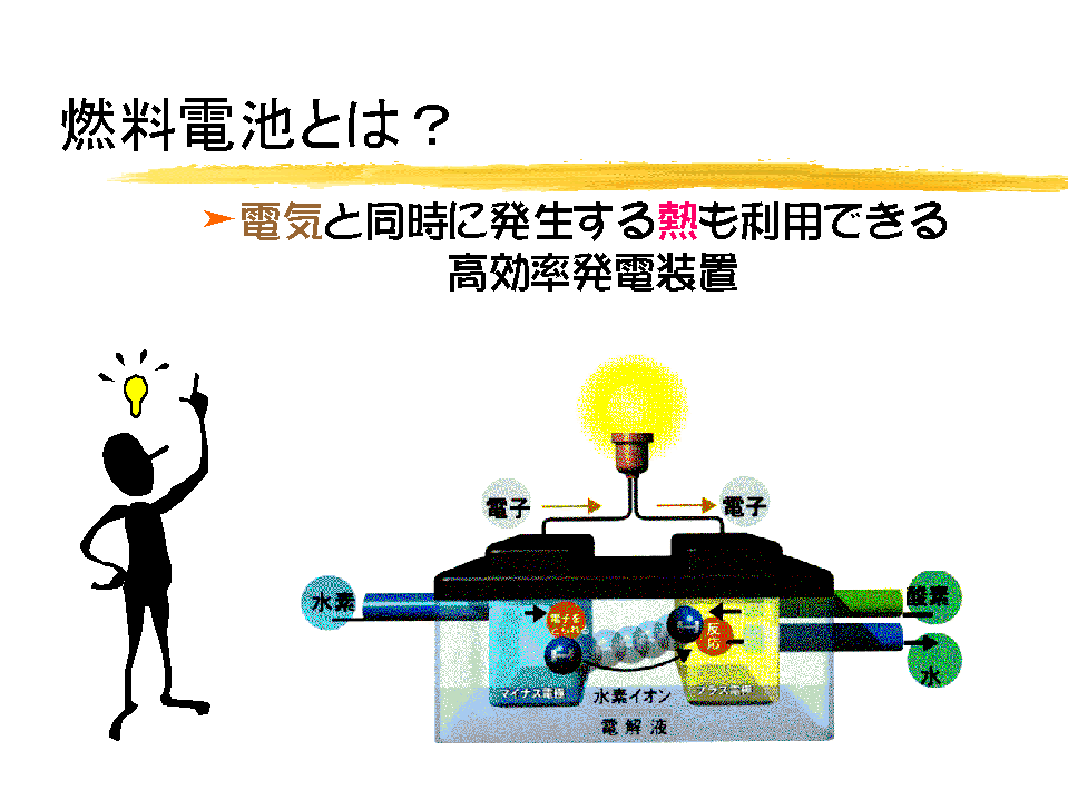 Mr.Mayorは,中学校か小学校の理科の実験で「水の電気分解」をやったことはありませんか?水に電極を入れて「酸素」と「水素」に分解するあの実験です。燃料電池はあの「水の電気分解」の逆の原理を利用したものなのです。
