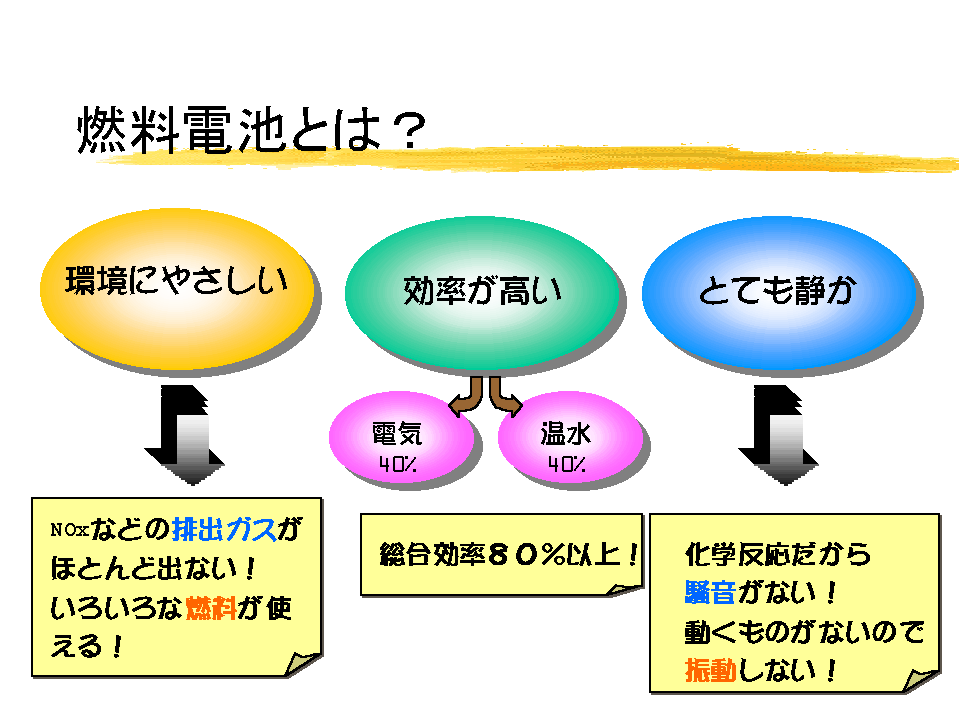 ねえ,すばらしいでしょう? ですから燃料電池は,NOxなどの排出ガスが出ませんので環境にやさしいし,温水もお使いになれば総合効率80%以上の大変効率の良い電気の素になります。そして何より,機械的に動く部分がございませんから,とっても静かなんです。