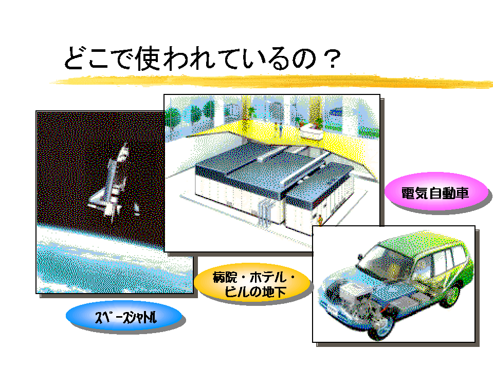 これまでにも当宇宙局では,MASAのスペースシャトルの電源としての実績から,大型の物ではビルやホテルの地下にそぉーっと置かれて活躍しておりますし,排出ガスを出さない電気自動車として,これから続々市場を広げつつございます。Mr.Mayor!ワンダーアイランドの将来をお考えでしたら,電気の素は燃料電池以外にはございません。燃料電池をどうぞよろしく!