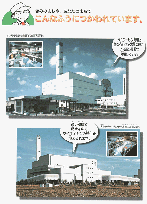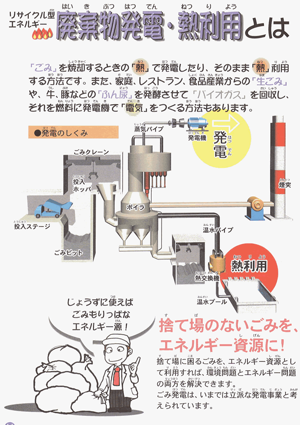 廃棄物発電は,全国各地のゴミ焼却場の中で行われているんですよ。ゴミ焼却施設の中に発電設備が備えられているので,外観からではよく分からないかもしれませんが,焼却場の中で必要な電気の足しにしたり,電力会社へ電気を売ったりしています。