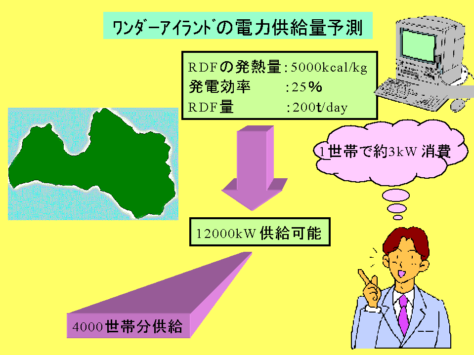 ゴミは各家庭から一年中必ず出るものです。ただしワンダーアイランドのように人口の少ない地域では,ゴミ焼却場に発電設備を導入するのに見合うだけのゴミは発生しません。そこで,市長さんにご提案があります。RDFを運んできましょう。RDFとはゴミから作られた燃料です。燃やしたときの発熱量が高いので,一日に200トンを輸送すれば1万2000キロワットの電気が供給可能です。1世帯あたり約3キロワットの消費電力とすると,廃棄物発電だけでも4000世帯に電気を供給できます。どうです市長さん,ゴミも立派な電気の素になるんですよ!