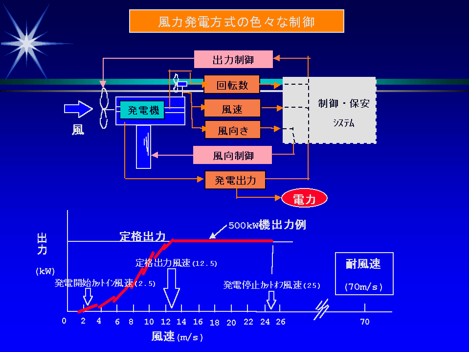 風速と電気出力の実測値がこれです。発電を開始する風速をカットイン風速といい,だいたい毎秒2.5メートルくらいから発電を始めます。500キロワットの風車の場合,定格出力に達するのは風速がだいたい毎秒12.5メートルくらいのときです。それより風が強くなっても,このような制御で一定の出力を維持します。もっと風が強くなり25メートルになると,カットオフといって出力をやめてしまいます。合理的でしょう?ご心配の台風に関しては,風速毎秒70メートルまで風車本体は耐えられます。日本の沖縄や八丈島でも実績がありますし,ワンダーアイランド仕様にも充分適用できますよ。