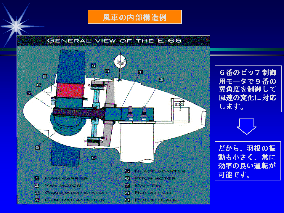 風車の羽根(ブレード)の角度は,ピッチ制御用モータ(6番)でブレード角度(9番)を制御しています。だから,風が強くても羽根の振動が小さく,つねに効率の良い安定した運転が可能なんです。どうです,すばらしいでしょう?