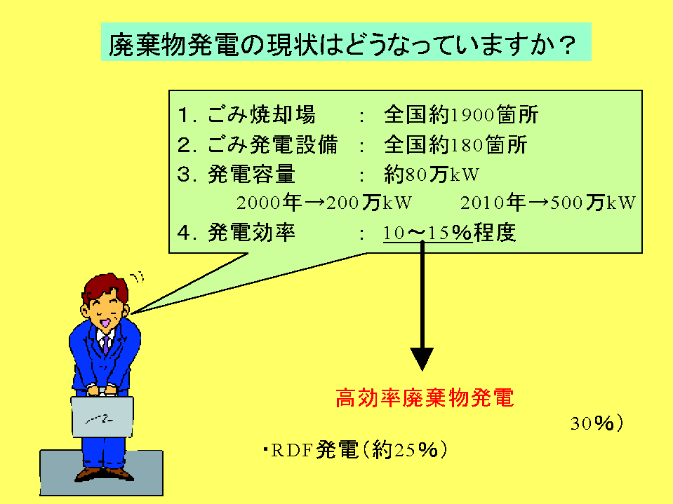 それではまず,廃棄物発電の現状についてご説明いたします。全国にゴミ焼却場は約1900ヶございます。そのうち,発電設備を備えているのは約180ヶ所です。発電容量は約80万キロワットですが,2010年には500万キロワットの導入目標が定められています。発電効率は10〜15%程度でやや低いのですが,ガスタービンリパワリング複合発電(約30%)や,RDF発電(約25%)などの高効率廃棄物発電の技術も進んできています。