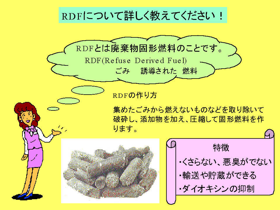 大丈夫ですよ。市長は難しかったようですけど,あとでこっそり教えてあげますから。今度は私からゴミーゴさんに質問なのですけど,廃棄物発電の現状についてもう少し詳しく教えていただけますか?燃料としてRDFというのを使うということだったのですけど,実際どんなものなのか,あまりイメージがわきません。つくり方やすぐれた点も説明していただけますか?