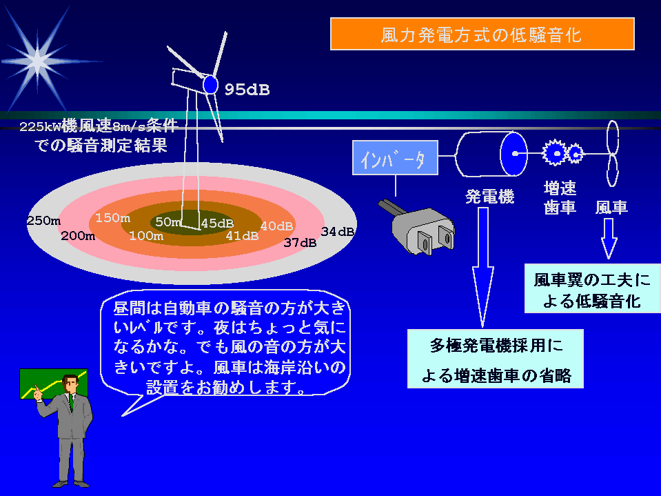 燃料サンも結構きついとこついてきますね。(もっと優しい方かと思ったのに!) 市長さんご安心ください。この図は当社の225キロワット機の騒音の実測データです。風車の羽根のところの中心では95デシベルなんですけど,真下の地表面では45デシベルになりますし,250メートル離れた場所では34デシベルにまで低下します。自動車の騒音の方が大きいレベルです。夜になるとちょっと気になるレベルですが,風車が建設される地帯は海岸沿いが多いので,風の音の方がよっぽど大きいですよ。当社では今でも低騒音化の努力を重ねていて,例えば翼の形状工夫とか,多極発電機採用によるギア音の廃止とか,いろいろな工夫を重ねています。これからは絶対風力ですよ,Ms.Fuel!