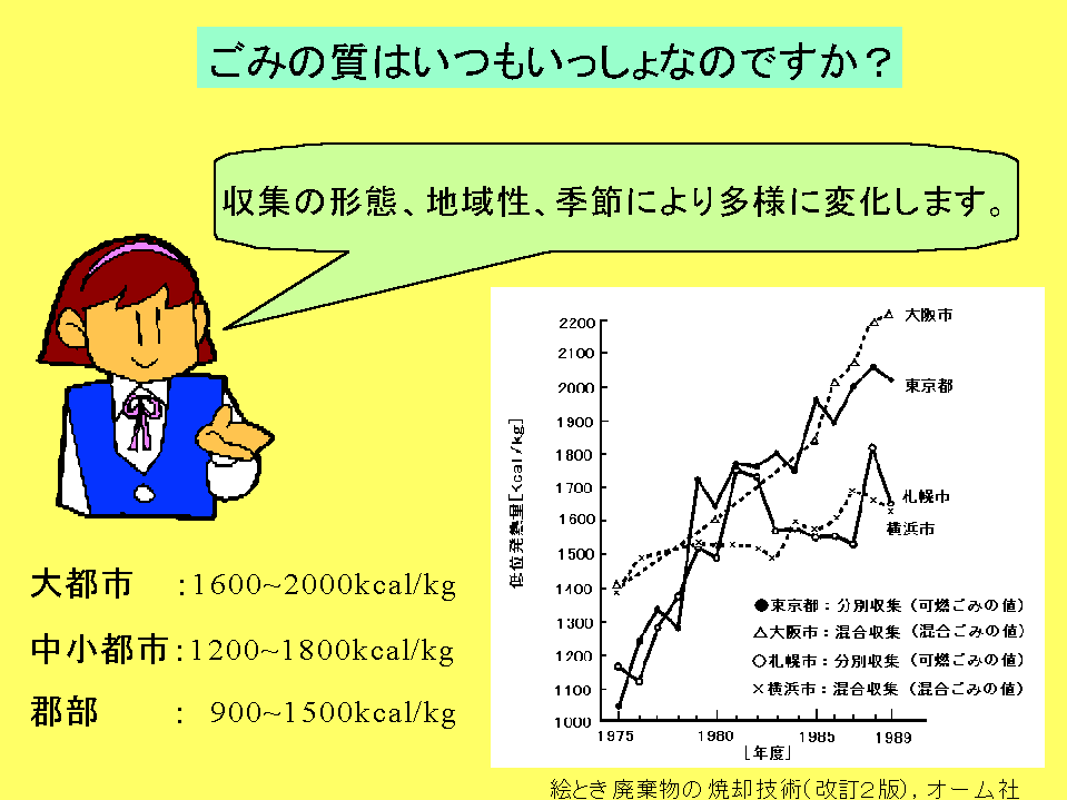 はい,ゴミの発熱量が高いほど発電量は増大します。ごみの質は収集のしかた(分別するか混合か)や地域,季節によっても違います。この図は大阪市,東京都,札幌市,横浜市のごみの発熱量ですが,このように場所によって異なります。一般に,都市のほうが農村よりもゴミの発熱量が高い傾向にあるようです。焼却施設の計画にはゴミの質についての調査と分析が必要です。ワンダーアイランドへは,発熱量の安定しているRDFを輸送いたしますので,心配しないで下さい。一年中安定した電気を供給いたします。