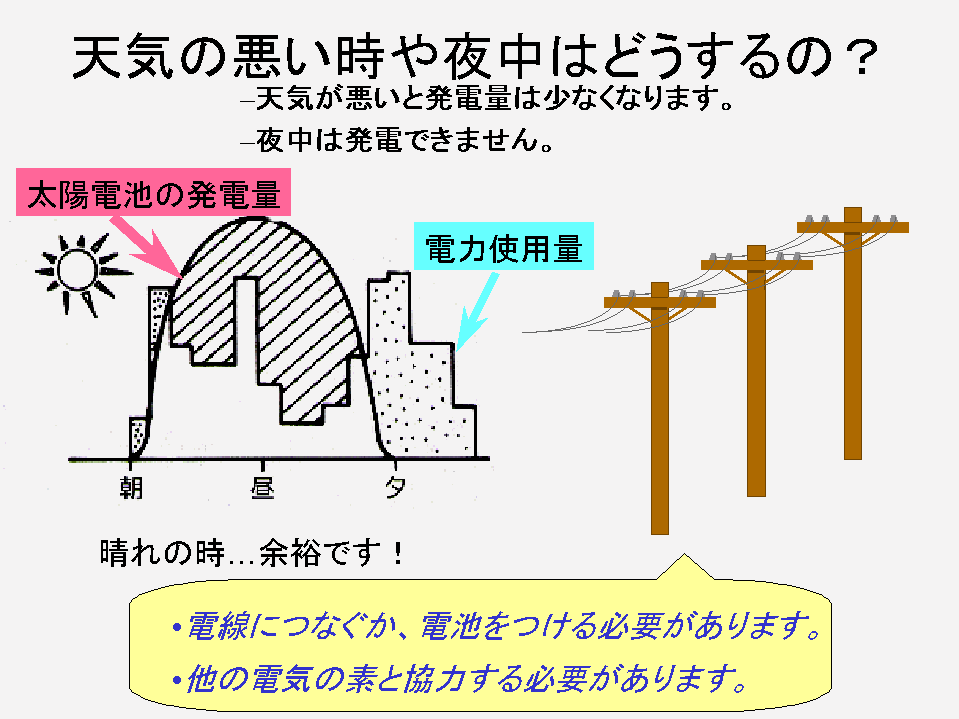 ところで,太 陽子さん。太陽光発電では,晴れたり曇ったり雨が降ったりすると,つくられる電気の量が変わってしまうでしょうけれど大丈夫なんですか?夜も電気がつくれないでしょうし。廃棄物なら一年中電気をつくることができるのに。