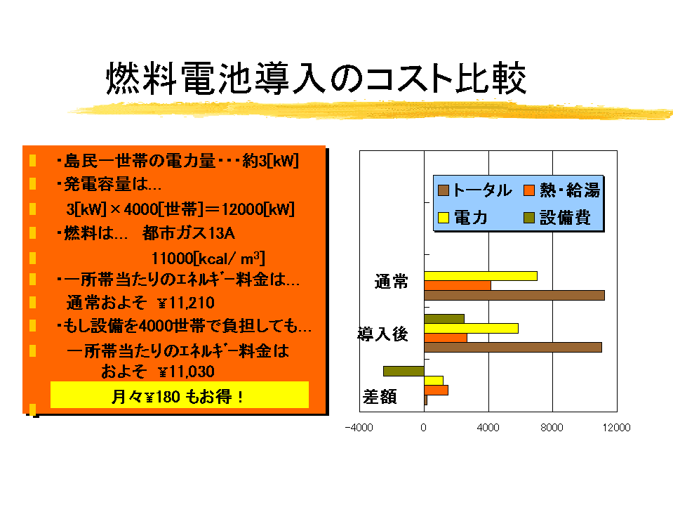 そうしますと,私どもの試算例では,こちらのワンダーアイランドが4000世帯ですから,燃料電池は1万2000キロワットの規模となります。燃料電池に必要な燃料は,どこのお宅でも使われる都市ガス13Aでよろしいですね?普通のご家庭で4人家族の1所帯あたり,電気・ガスの両方で,ひと月およそ1万1210円のエネルギー料金がかかると言われています。でも,もし燃料電池を導入いたしますと,ご家庭の給湯も燃料電池からになりますし,熱交換システムを導入なされば,空調分もこちらからいたしますので,その分経費がお安くなります。結局,なんと全島民で燃料電池の設備を負担なさったとしても,月々1万1030円となりまして,180円の黒字になるんでございます。いかがですぅ〜?太陽さんも導入をお考えになりませんかあ?