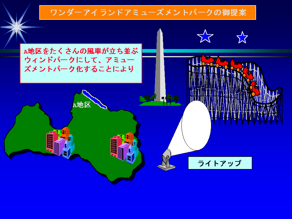 OK!待ってましたよ,そのお言葉。何をかくそう,当「ウィンドパワー」社は土地開発もやっているんですよ。今回ご提案のA地区は将来都市化が予想されるこれらの地域とはすこし離れていますが,都市部とリニアモーターカーで接続して,この地区を一大アミューズメントパークにしてはいかがですか!風車は観光の目玉にもなるし,パークのライトアップや施設の電力も供給できるし一石二鳥ですよ。It’s dreaming ワンダーアイランド!これで決まりですね!