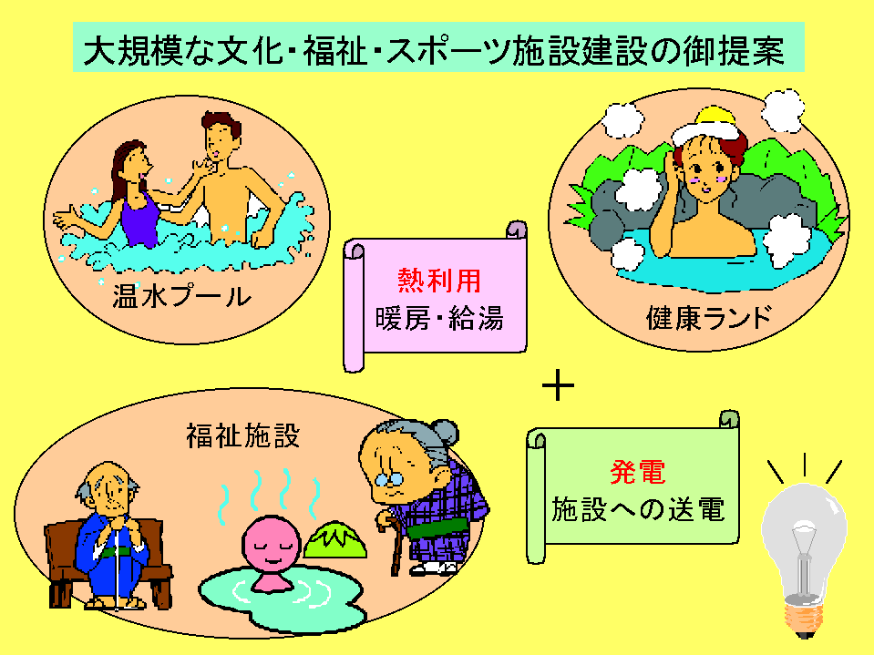 ワンダーアイランドにも当然ごみの焼却場は必要でしょう。その時は,ぜひ発電設備も導入してください。さらに,焼却場に隣接して,大規模な文化・福祉・スポーツ施設「エコランド」を建設しましょう。もちろん,施設の電気の素は「ごみ」です。熱も温水プールや福祉施設のお風呂などに有効利用しましょう。それが実現した時,ワンダーアイランドはお年寄りや環境にやさしい島,他の模範となる島になることでしょう。ぜひ私どもにそのお手伝いをさせてください。夢のあるワンダーアイランドばんざーい!!